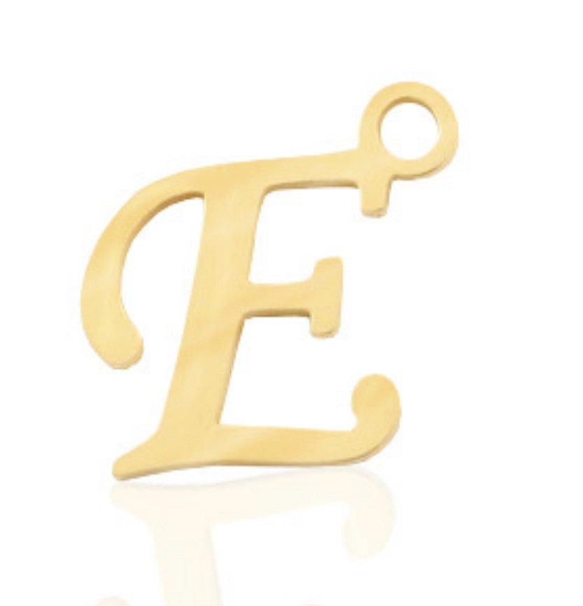Met deze bedels van Stainless steel Roestvrij staal (RVS) initial E creëer je de persoonlijkste sieraden. De bedels zijn verkrijgbaar in zilver en goud en van A t/m Z. Deze bedel is uitgevoerd in de kleur goud. De diameter van het oogje is ca. 2.2mm. Materiaal: Roestvrij Staal (RVS). 14x12mm.
